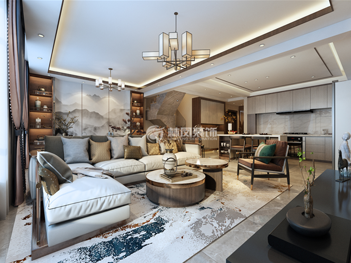 旭辉璟宸府200平三室两厅新中式风格林凤装饰的客厅从空间结构来讲,宽敞明亮的客厅无疑是整个空间的主题,长达7米的开间,更能体现业主所要求的延伸感。新中式等一系列的古典主义风格,精髓在于尽肯能的进行轴线对称,在客厅与书房的布置上,做到协调统一,并且互为彼此的进深背景。理石电视墙与书房背景形成的对应关系,使此开放空间占据了主角位置。