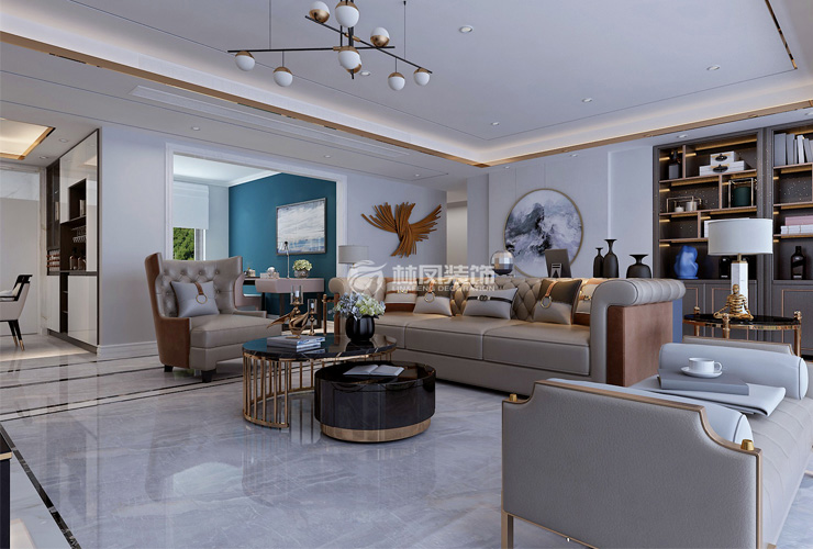 三室两厅一厨两卫,高层整体采用美式风格,色调以深色为主,体现美式的居家感和温馨感。