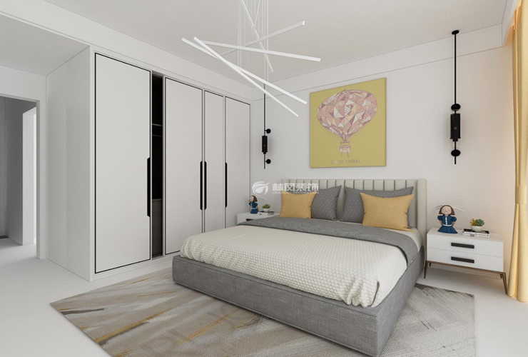 阳光100现代风格140平三室两厅林凤装饰的卧室主要通过软装的结合让卧室完美呈现欧式风格。根据不同卧室的功能需求,采用了不同材质的柜门和颜色,地面地板,让卧室显得更加温馨