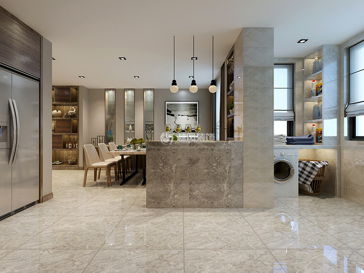 银河丽湾220平四室两厅新中式风格林凤装饰的餐厅与开放式厨房相连,透景的设计令空间灵动而有趣。