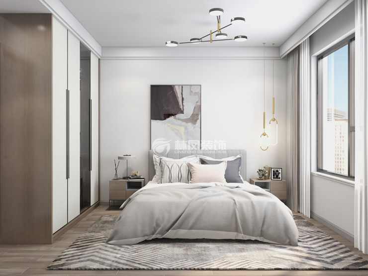 【主卧室说明】顶部不做吊顶,用线条装饰,干净利落,暖灰亚光的地板很符合空 间的属性;【次卧室说明】次卧于主卧一脉相承,色调以白色为主,搭配暖灰的木色。