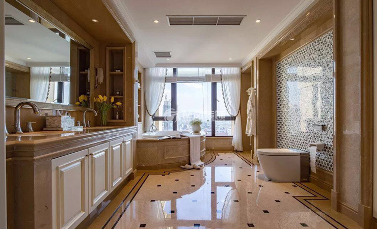 嘉山墅500平别墅混搭风格林凤装饰的卫生间做了功能的划分,单独的淋浴区,单独的镶嵌浴缸,定制的大理石浴室柜,墙面采用了理石套边,整个空间奢华大气。