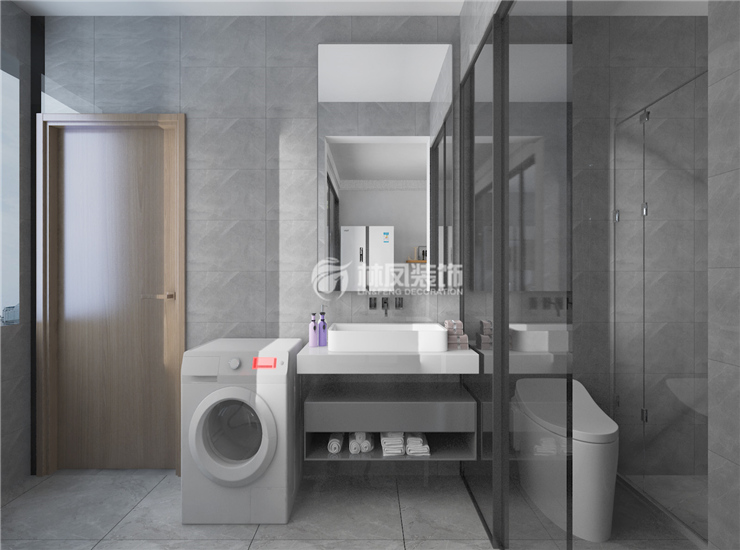 九颂大院109平三室两厅现代极简风格林凤装饰的卫生间做出了干湿分离的空间 把洗衣机和手盆 单独放在了干区 在不干扰用坐便的同时 也增加了手盆的台面空间 也使得洗衣机离晾衣区更加方便