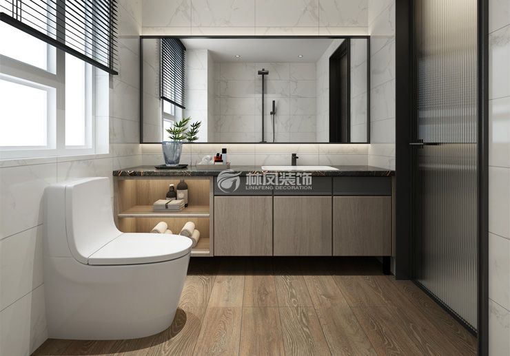 浦江苑165平两室两厅现代风格林凤装饰的主卫生间的墙面采用白色带纹理的瓷砖,地面采用深色木质地板,颜色成熟稳重的同时又不失品位。