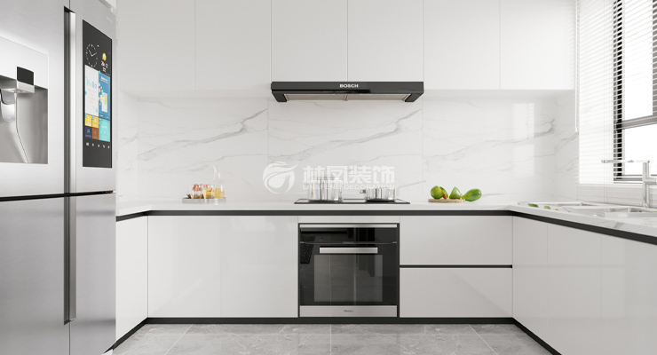 绿城全运村留香苑170平三室两厅现代风格林凤装饰的厨房是烟火之地,橱柜用纯白色搭配上纯白色墙砖让整理空间更加明亮干净