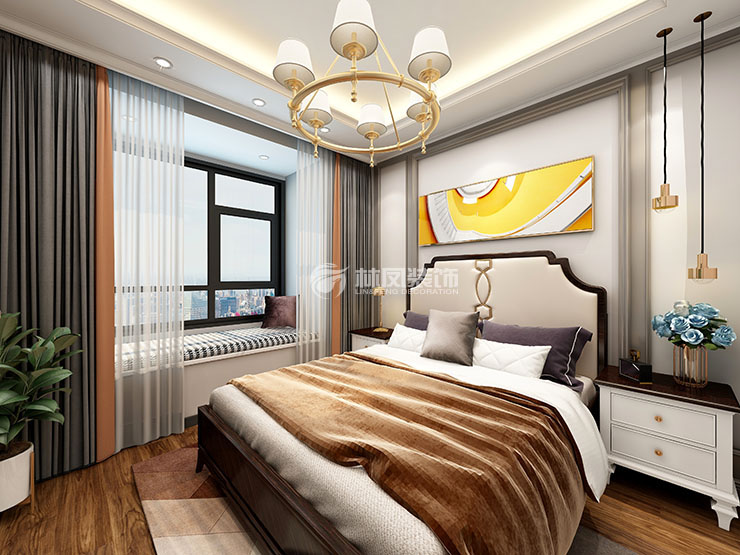 汇景新世界157平三室两厅美式轻奢风格林凤装饰的卧室的衣柜和护墙板选用了同种材料、同种线条,整体感十足.床头的金色挂件使整个空间更具时尚感,整个房间整体色调较浅两个明亮的黄色抱枕和深色毛毯便成了整个房间的“点睛之笔”,让房间不至过于清冷.