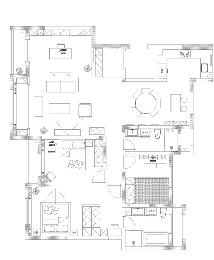 设计理念:三室两厅一厨两卫,高层整体采用美式风格,色调以深色为主,体现美式的居家感和温馨感。