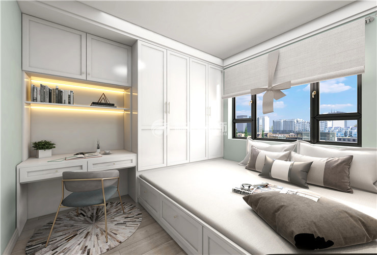 主卧室做了一面嵌入式衣柜,白色门板干净整洁。床头背景墙刷了一面肉桂色的乳胶漆,让客户疲惫的身心在踏入主卧里有个温馨的休息环境,次卧室做了榻榻米,增加了储物功能,孩子可以在次卧休息。里面还设有书桌,办公、休息兼得。书柜上放安放灯带,让次卧增贴光感和温馨的感觉。