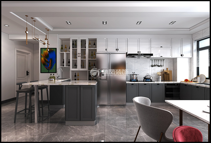 开放厨房是业主喜欢的设计,橱柜整体储存空间强大,和餐厅客厅完美衔接,入户后空间感极强,达到业主对厨房功能和需求的满足