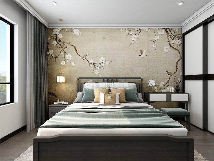 主卧空间并不大,好在有独立的衣帽间,衣帽间设置为木质框架的拉门,背景墙用中式风格的壁纸增加整个卧室的氛围感。