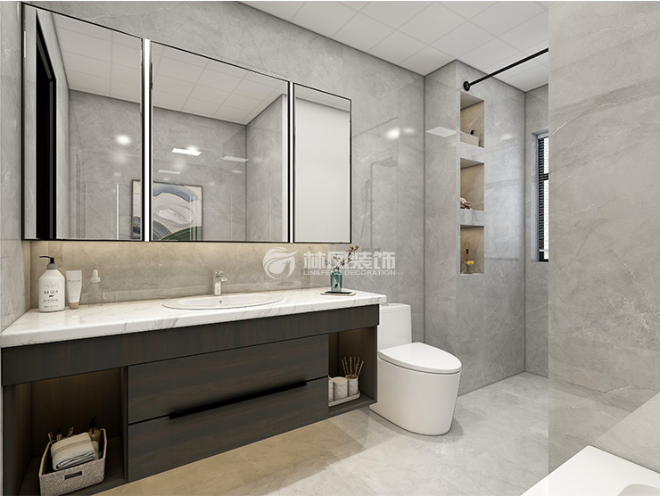 这户的客厅空间比较紧凑,恰恰给空间的多样性增加了可能。电视墙的旁边是进入南次卧的过道,同时也是次卫干区的入口,所以在干区增加了木质格栅,突出中式元素,呼应中式茶几与电视柜。
