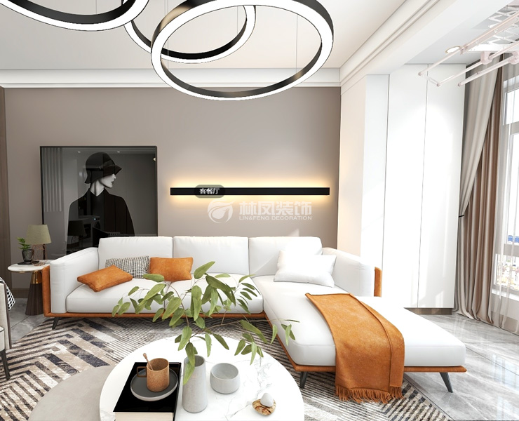 餐厅整体看起来是和客厅颜色呼应的,橙色系灰色系点缀着小餐吊。看起来很舒服,简单。颜色更加明朗。