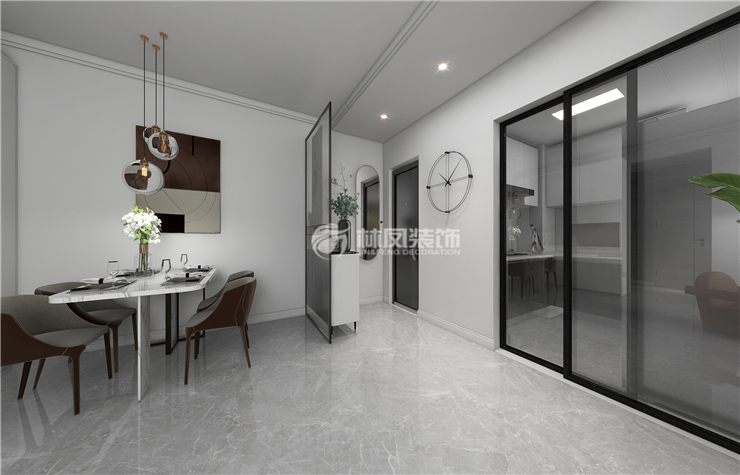 餐厅空间与客厅在一个空间,以简洁和实用为主,灯光以温馨为主。在餐桌的墙面上摆放一些装饰画,增加餐厅的情调。