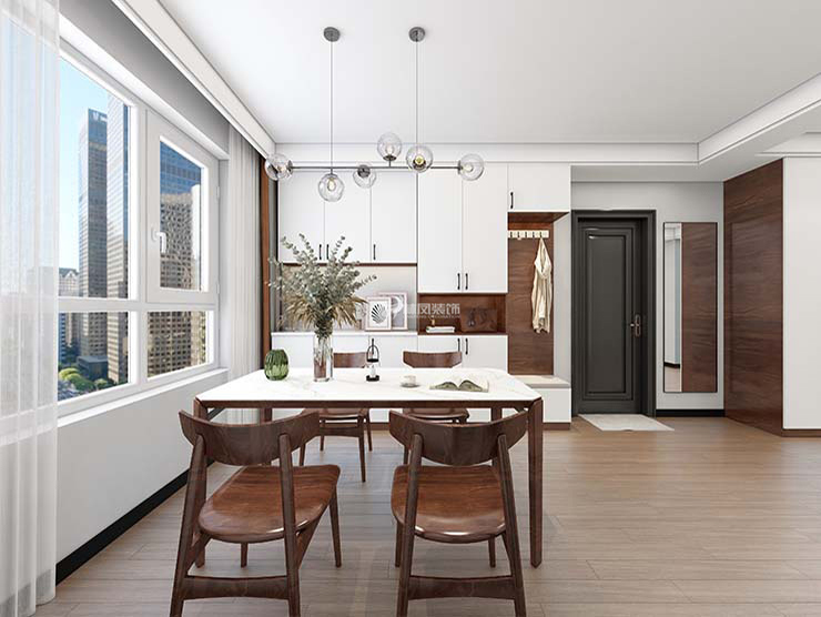三室两厅一厨两卫,高层整体采用美式风格,色调以深色为主,体现美式的居家感和温馨感。