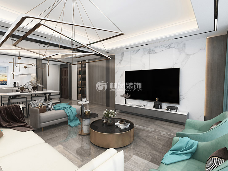 客厅是一家人的主要活动的空间,所以采用3+2+1座位的沙发,地面采用灰色800*800的地砖,棚面天花是石膏板造型棚,沙发背面是全屋定制的酒柜整体软装与硬装搭配在一起凸显现代轻奢的设计风格。
