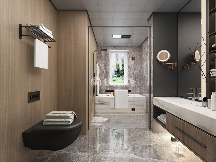 卫生间采用定制的浴室柜,墙砖与地砖采用同纹理灰色的仿大理石瓷砖,干湿分离的淋浴和浴缸。