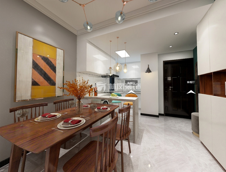 餐区厨房处为业主重新规划了格局,添加了转角的吧台,使得餐厅有更多储物及休闲空间,又巧妙的拉伸了厨房的空间感,颜色上使用了主体色灰蓝,打破了千篇一律的暖色就餐区,使客餐厅整体更加协调统一。