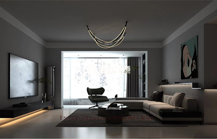 客厅说明: 整体暗黑风格的设计主导,同时兼顾美观以及主会客的功能。客餐厅一体,大面落地窗使得光线轻松走进,动线流畅。高级黑最大的特点就是让空间看起来很厚重,档次很高。