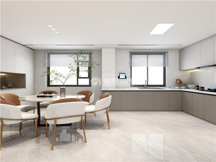 餐厅说明:餐厅部分延续了厨房灰白色系 ,白色理石的台面使得整个厨房的光线提升一个高度 ,大理石材质的餐桌搭配金属质感的桌腿,使餐厅空间更有质感,更加简约时尚。