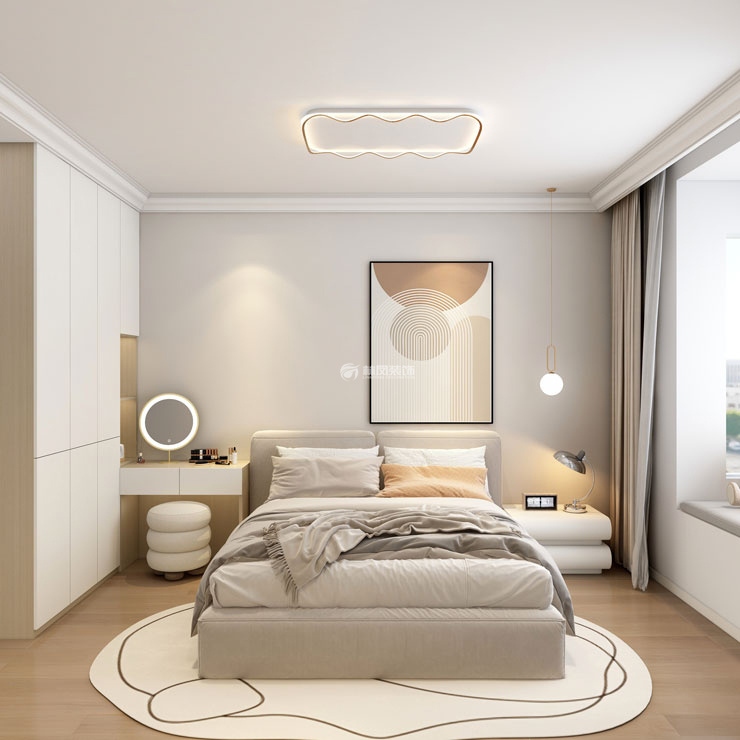 主卧室说明:主卧室女主唯一的要求是要有梳妆台,因为妆台设计方面结合了衣柜的设计,这样整体设计,不仅规避了衣柜门打不开的弊端,同时妆台插进衣柜设计也增加了梳妆台的空间使用。主卧墙面也是采用了浅色乳胶漆饰面,配上舒适的布艺床,置身其中仿佛在自然呼吸,满足内心深处的宁静感。