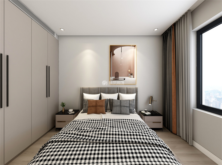 主卧室说明: 主卧室与整体风格保持一直,使得整体效果更加完美.通顶衣柜,增加了空间的储物功能,床头柜上摆放了一些装饰,使整个空间更加温馨。