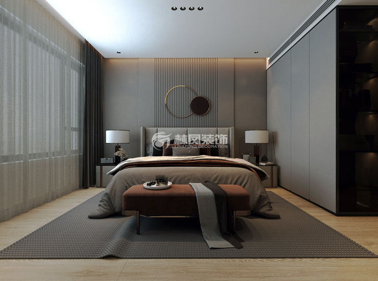 卧室说明:主卧室采用了衣帽间套卫生间的设计,使得卫生间不直接面对主卧室。主卧也采用了无主灯设计,灯光可以明暗调节更加多样性,衣帽间的迎面做了玻璃门显得不沉闷。