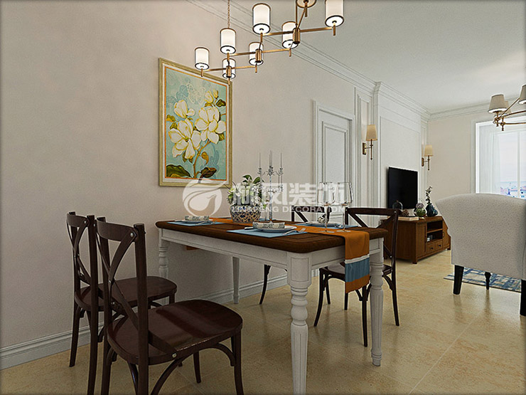 客厅作为待客区域,一般要求简洁明快。整体而言,简美风的客厅宽阔明朗却不单调。客厅选择的是布艺的沙发,在美观的同时,保证了良好的舒适和透气性,茶几旁的白色单椅连接客厅与餐厅的空间。沙发背景选用浅色挂画作为点缀,浅色系的轻松感与沙发休息放松的功能相得益彰,另一边的电视背景墙用简单的乳白色自然地融入周围墙体,不会喧宾夺主,并使客厅整体感更强。暖色系的吊灯配合木色的茶几、电视柜中和了墙体、沙发和地毯带来的大面积冷色,让家回归温馨。
