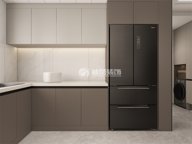 厨房说明:结构上采用开放式,这样看起来空间会宽敞很多。其厨房地面材料全部采用和客厅同样的瓷砖铺而成,灶台台面全部采用的是白色,上橱柜用的是全屋的主色系,和鞋柜餐边柜以及电视柜一样的颜色,看起来更整体干净、利索、整洁。