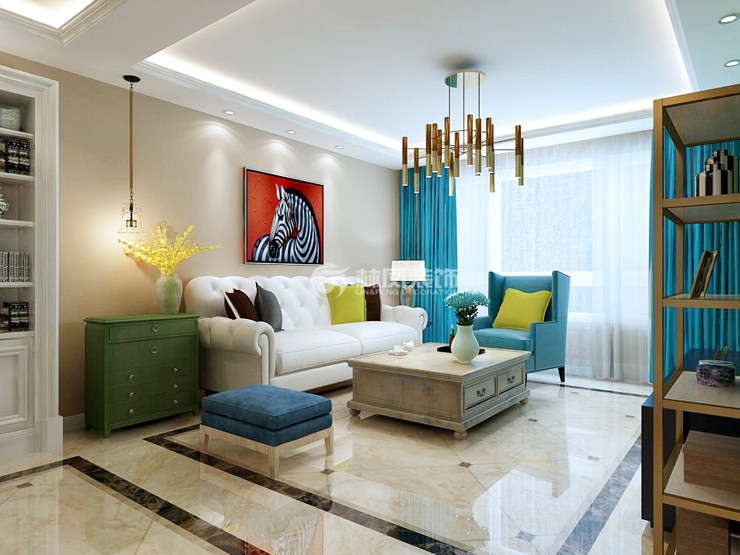 客厅沿用了当代美式风格特点的家具,蓝色与黄色高饱和度色彩的碰撞冲击视觉,电视墙去掉繁琐复杂的造型,用一整面墨绿色的壁纸,让整个客厅充满活力。