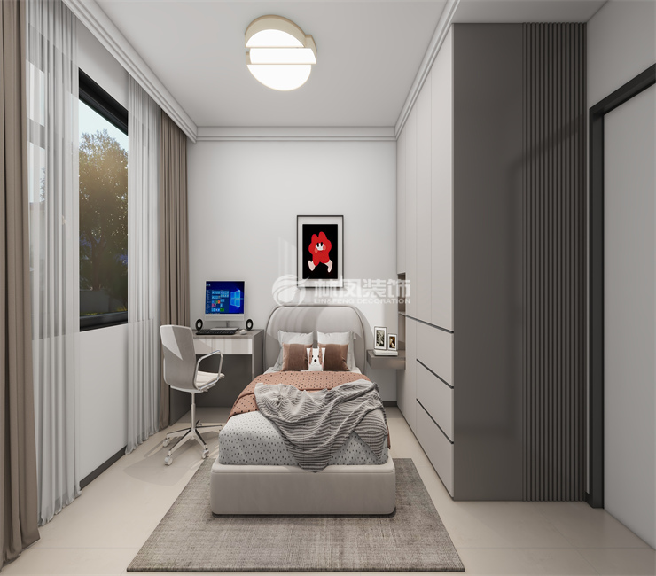 卧室说明: 延续整体风格的特点,以灰色半墙板加入灯带的元素,显得优雅有格调背靠背的为主人提供了充足实用的衣服收纳位置。