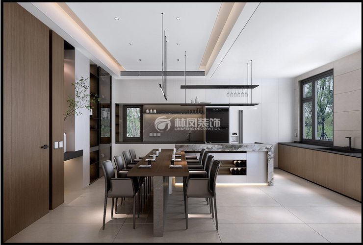 半开放式布局方式让厨房和餐厅融为一体,打破传统餐厅的沉闷。L型厨房设计,洗切炒动线流畅灵活