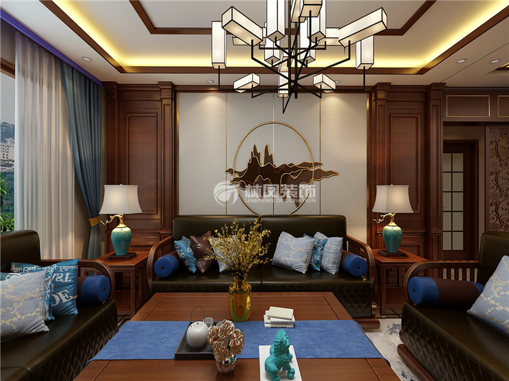 客厅我们在设计的初衷采用了很多木质结构,这个是客户所喜欢的,但是老式的中式过于沉闷,所有在做设计的时候我们更多的考虑做新中式的风格,所以我在做客厅的时候加入了很多的现代元素,让整个空间更加的现代,轻松,而且还不失稳重。