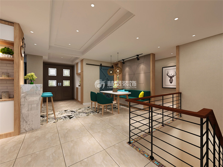 半高的背景墙加上文化石的纹理使得客厅和餐厅更加通透,背景右边的竖色 条纹将北欧风格的原木色展现的淋漓尽致。