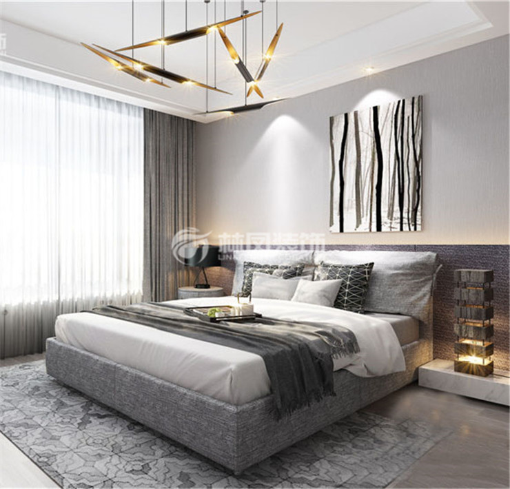 卧室以灰色这种淡然明亮的色调出现,它的整个面积并不大,由于卧室的核心设计是床与衣柜,所以除了摆设这简约的双人床和卧室必备的衣柜、壁灯以外,没有再过多的放置其它物品。整个卧室呈现出一种淡静的清新感,简约而素雅。