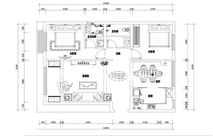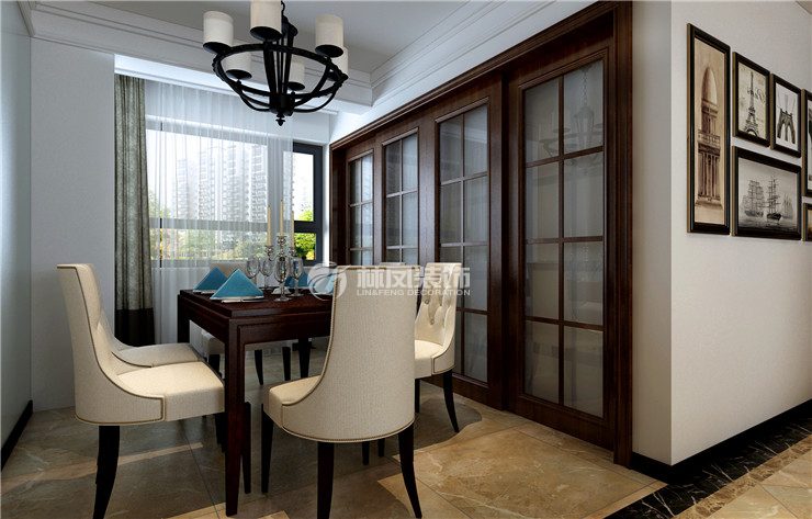 美式餐厅即西式餐厅风格,渲染,体会异国餐饮情调为目的。实木餐桌和白色的墙体石膏线搭配显示出来餐厅的感觉而不显得老气