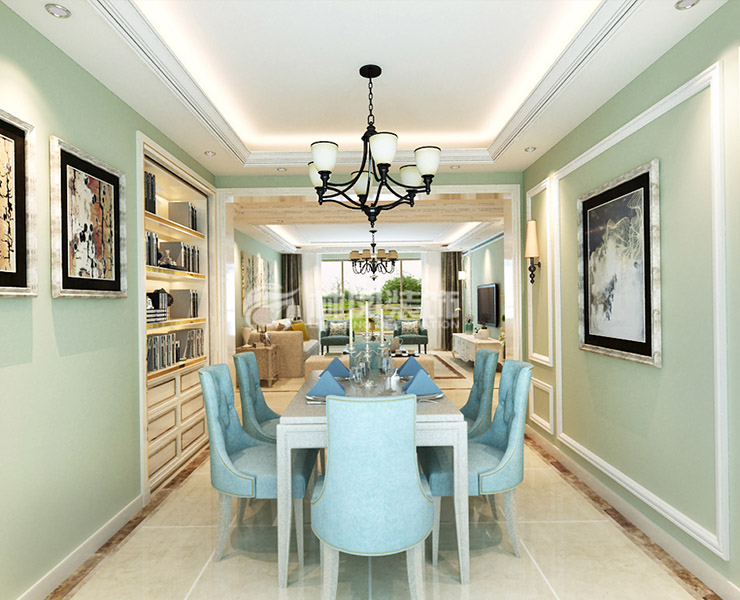 欧式餐厅即西式餐厅风格,渲染,体会异国餐饮情调为目的。嵌入式酒柜的设计把原有的餐厅缺陷规避掉形成归方效果,而背景墙则选择了简单石膏线做效果,让餐厅更加的简洁大方。