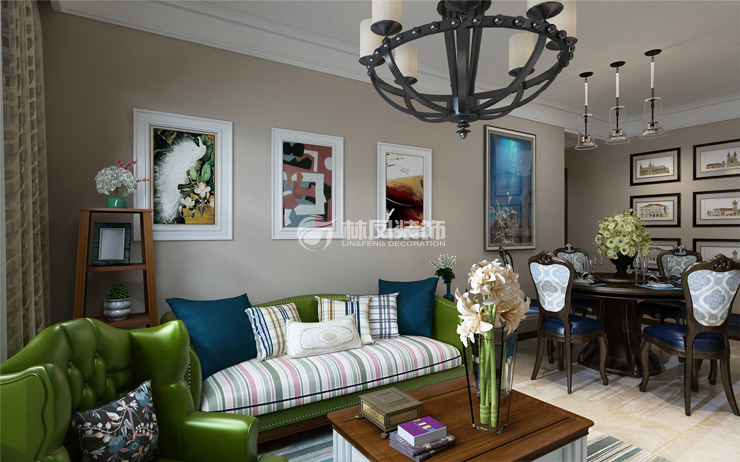 客厅采用皮布结合沙发搭配有时尚感觉,颜色的运用,高端中不失浪漫的气息,简约美式的起居室主要需要突出的就是年代感,所以材质纹理与颜色比较挑剔一些。