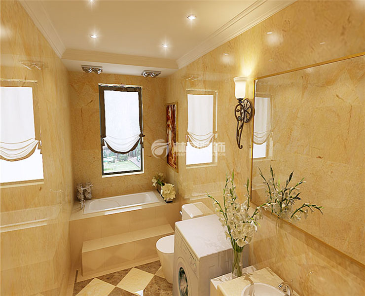 卫生间整体墙面以仿理石纹理墙砖进行铺贴。地面以两个颜色瓷砖进行了拼贴同时还做了一圈波打线为整个公共空间地面的相呼应。同时设计了独立的浴缸设计。不仅可以享受的泡澡乐趣,同时也是盥洗大件物品理想的盥洗池。