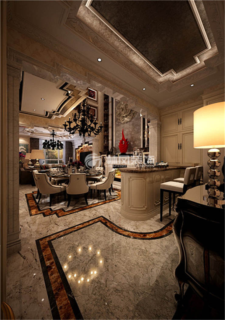 客厅棚面做的较为复杂,每个棚的立面都运用了金箔做修饰,与家具的金饰线条搭配起来,很是融合,墙面多用软包材质做修饰,增添贵族气息,地面的理石拼花更是采用与棚面呼应的线条,使整个空间,不管是在颜色还是线条方面都具有十足的法式气息。