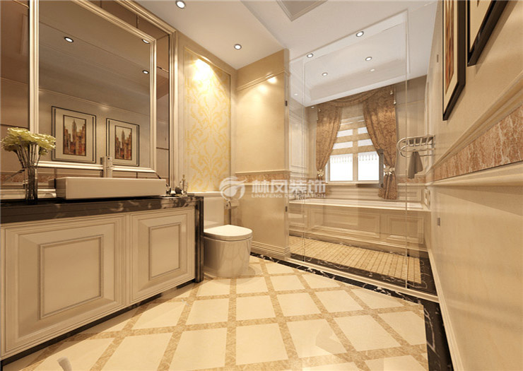 卫生间空间较大,所以在瓷砖铺贴上画了很大的心血,整体地面也运用瓷砖造型做了区域划分,高端并符合整体设计理念。