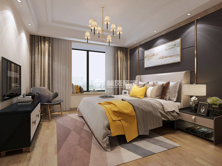 本案的卧室采用了米黄色地板,延续了客厅的暖色调,利用灰色的布艺床,平衡整体的色调,利用蓝色的软包增加了神秘感,明黄色的软装床品同样使整个卧室空间鲜活起来,整体软装与硬装结合的色彩搭配,给您更加舒适的睡眠环境。