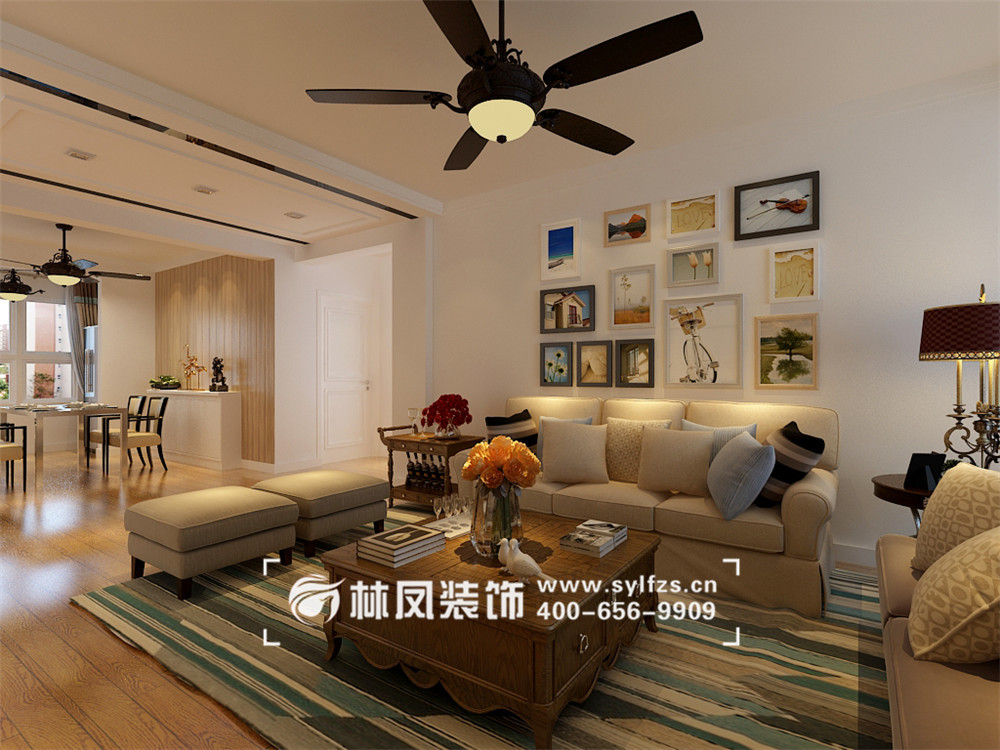 三室两厅一厨两卫,高层整体采用美式风格,色调以深色为主,体现美式的居家感和温馨感。