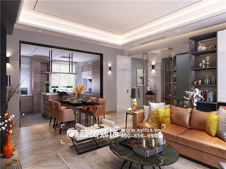 三室两厅一厨两卫,高层整体采用美式风格,色调以深色为主,体现美式的居家感和温馨感。