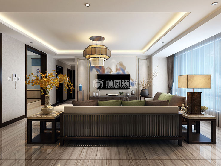 三室两厅一厨两卫,高层整体采用美式风格,色调以深色为主,体现美式的居家感和温馨感。