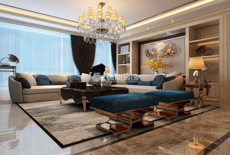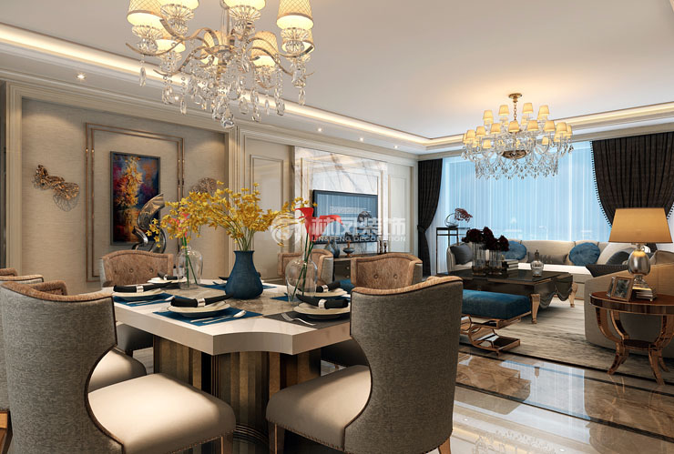 本案的客厅是采用米白色布艺沙发和深褐色混油茶几两种色彩搭配为对比色调,使客厅空间色彩分明,空间感十足。电视背景墙中心理石采用啡网云石纹理的进口天然大理石,再通过加工出理石雕花线,让电视背景墙显现的金贵和精细,两侧再用大弧度木线收边,护墙板做隐藏门来体现电视墙面的整体效果,沙发背景墙使用米白色的护墙板作为主体,木线收边,再用硬包装饰中心区域,来达到客厅的整体效果及协调性。