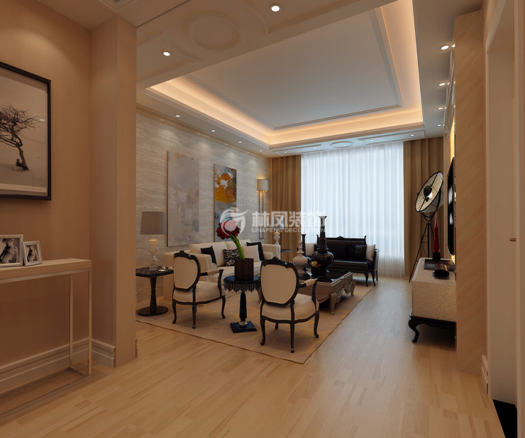 三室两厅一厨两卫,高层整体采用美式风格,色调以深色为主,体现美式的居家感和温馨感。