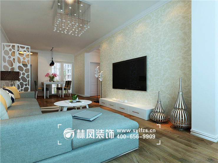 整体采用石膏线做装饰,墙面以碎花壁纸做装饰,沙发一侧以三幅壁画做装饰,整体简洁明亮。