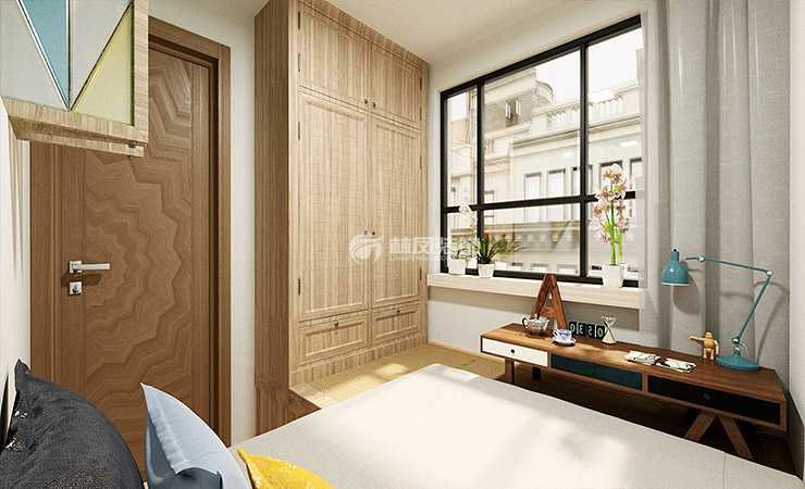 北欧风格卧室,采用原木色榻榻米设计,增加整体储物空间,色彩简洁明快,以白色原木色为主,整体空间实用温馨。