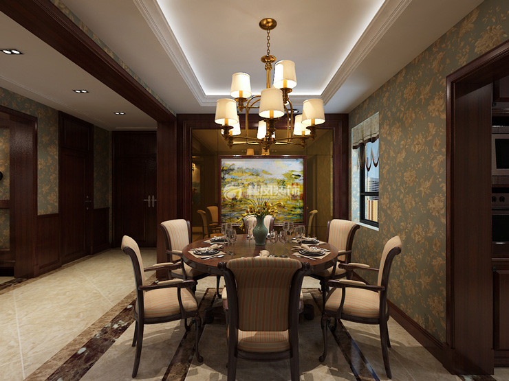 餐厅风格采用直线造型为吊顶,以及深木色的六人位餐桌,柔光大理石作为地面装饰材料,效果极佳,营造出温馨的空间。