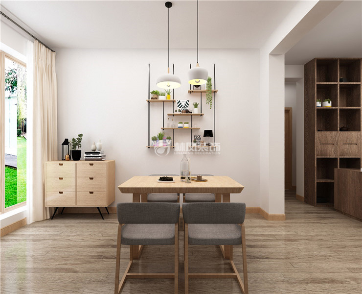餐厅的墙面装饰品,自由的形状更显日式的自由简单感,使用有错落感的吊灯使空间更具时尚感。